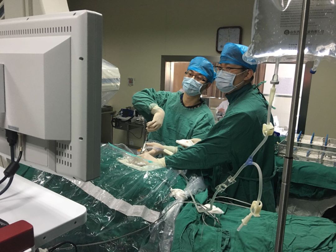幸运的是,我院骨科引进了椎间孔镜技术,创伤小,风险低,恢复快,效果肯定。在做了详细的术前评估及准备后,李金戈大夫为王奶奶实施了椎间孔镜手术,透视下穿刺针进入腰椎间隙,插入椎间孔镜将髓核完整取出,进行间盘内减压……