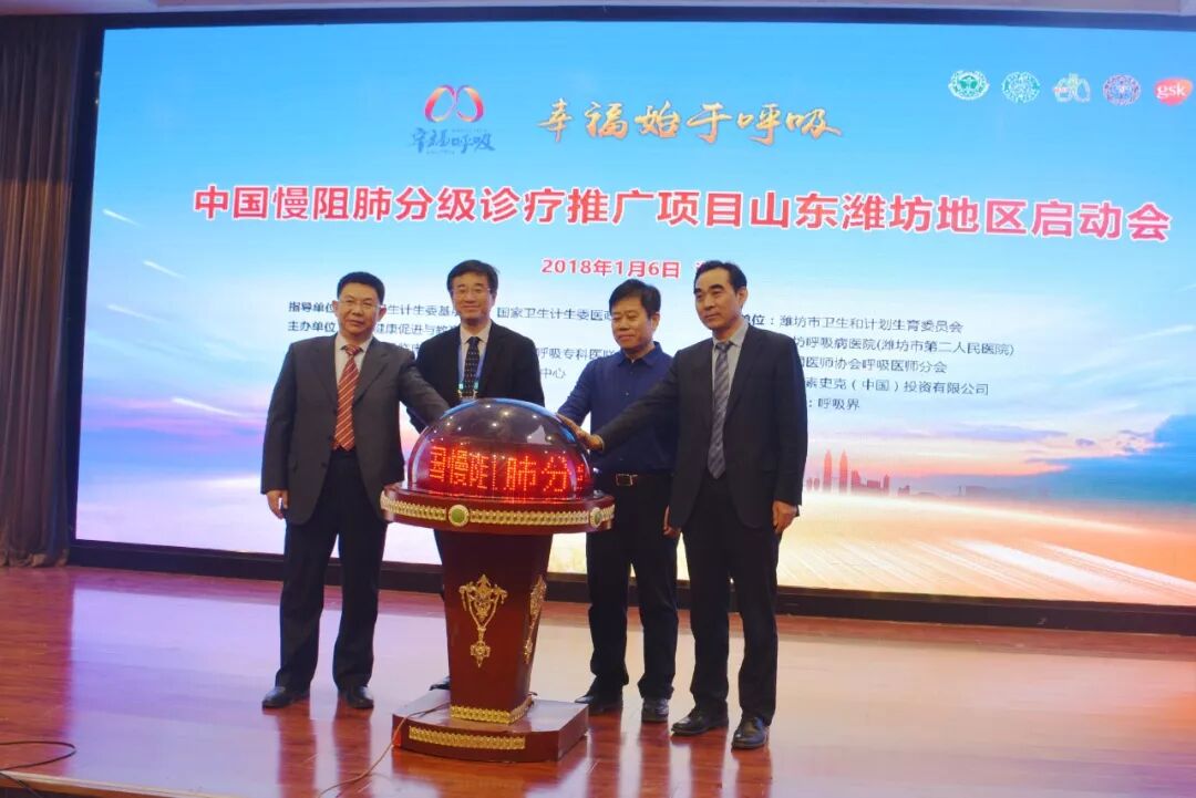 2018年1月6日,“幸福呼吸”中国慢阻肺分级诊疗推广项目潍坊地区启动会成功举办。中国工程院院士、中日友好医院院长王辰,潍坊市卫生和计划生育委员会党委书记、主任吴海源,国家卫计委远程医疗管理培训中心主任、中日友好医院信息中心主任卢清君,中日友好医院医改和医疗发展办公室主任贾存波,山东大学齐鲁医院教授、博士生导师、山东省基层呼吸疾病防治联盟执行主席曲仪庆,潍坊呼吸病医院(潍坊市第二人民医院)党委书记、理事长杨国儒等出席启动会。潍坊市卫生和计划生育委员会党委委员、副主任李宗泉主持启动会。