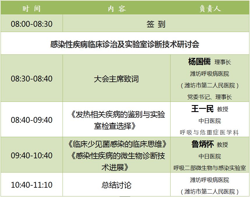 本次会议有幸邀请到了中日友好医院王一民教授和鲁炳怀教授,届时,与会专家将分别就《发热相关疾病的鉴别与实验室检查选择》、《临床少见菌感染的临床思维》和《感染性疾病的微生物诊断技术进展》进行深入的探讨交流,欢迎您的到来。
