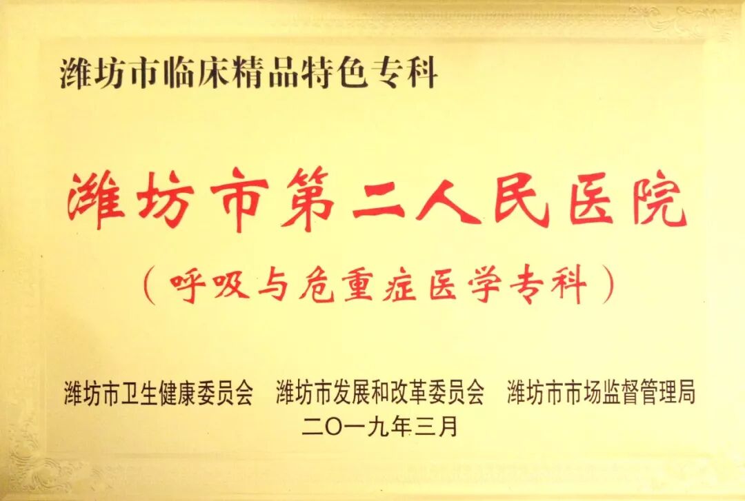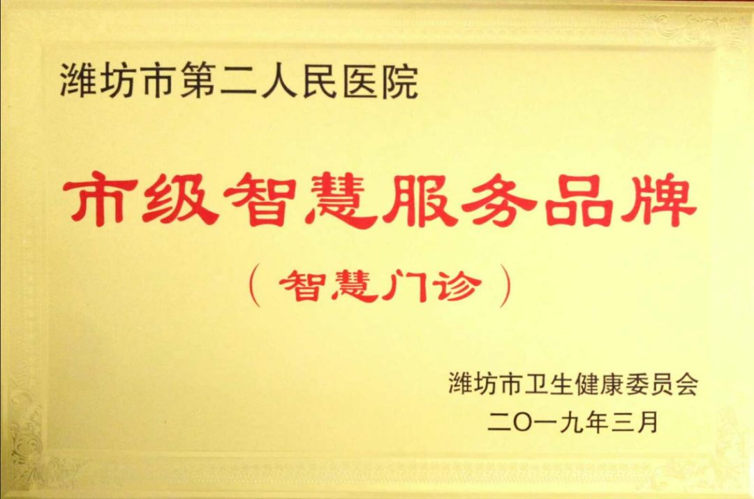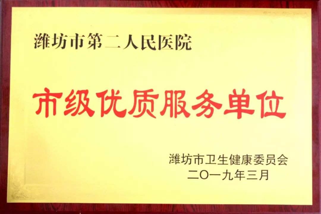 2019年3月26日,2019年全市医疗管理工作会议召开。潍坊市第二人民医院喜获市级智慧服务品牌(智慧门诊)、市级优质服务单位、潍坊市临床特色精品专科(呼吸与危重症医学科)三项荣誉。潍坊市卫生健康委员会一级调研员王好道作工作报告,潍坊市卫生健康委员会党组书记、主任,市中医药管理局局长吴海源作讲话。潍坊市第二人民医院党委书记、理事长杨国儒在会上作典型发言。